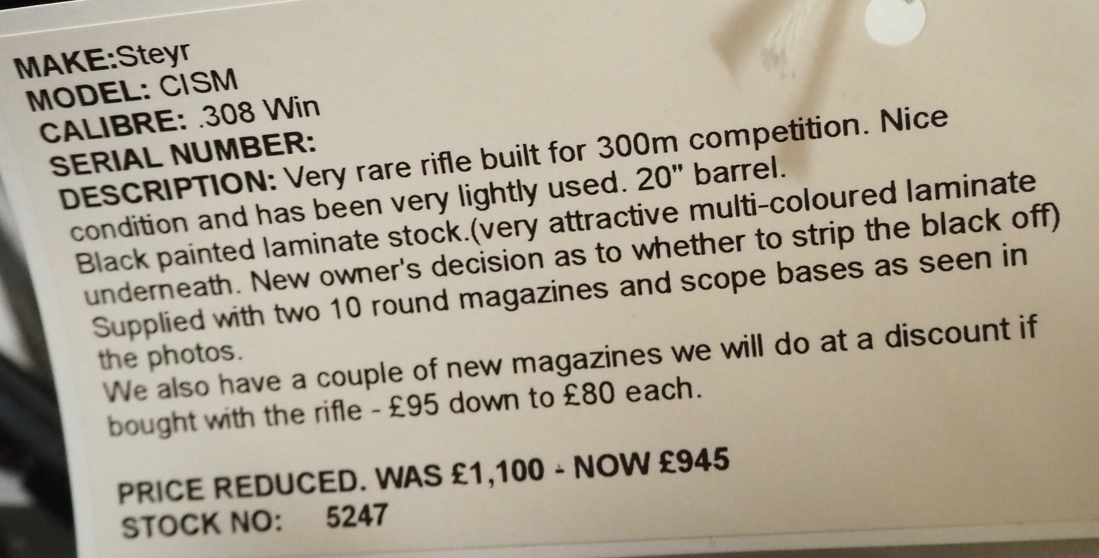 Owned by one of our members who used it rarely. 20″ barrel. Supplied with two 10 round magazines. We have additional magazines available at £80 each if bought with the rifle – usual price £95.
